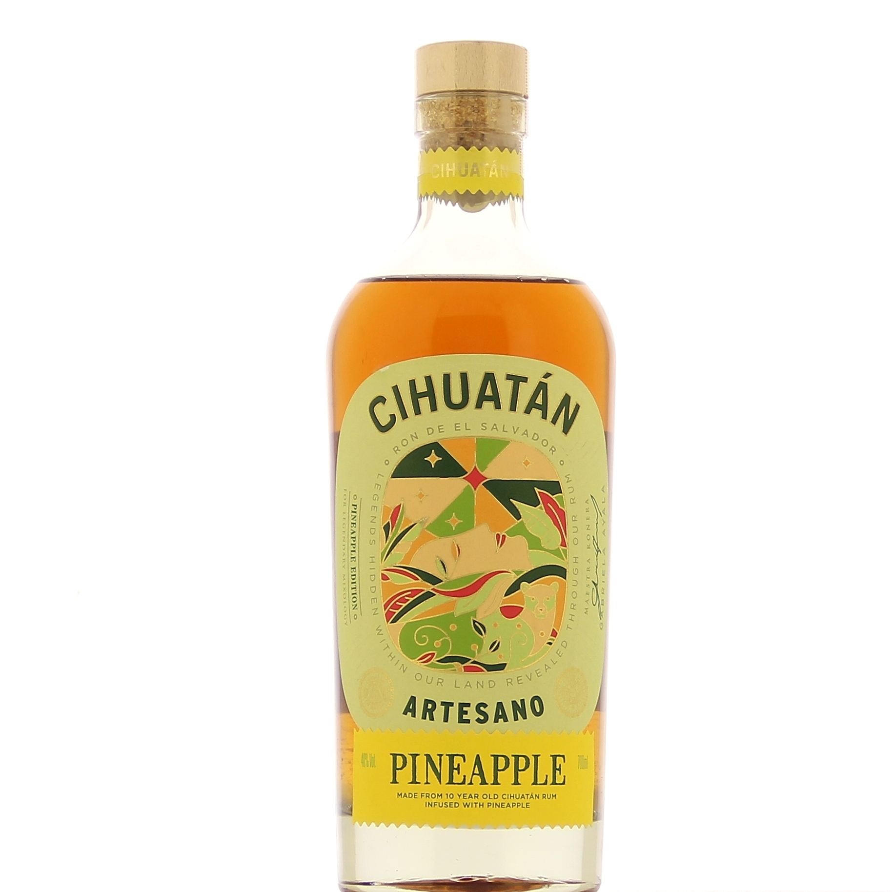 Cihuatan Rum Artesano is a Salvadoran rum made from molasses and distilled in a column still. It is aged for ten years in ex-bourbon American oak barrels. It is then infused for two months with local golden pineapples.